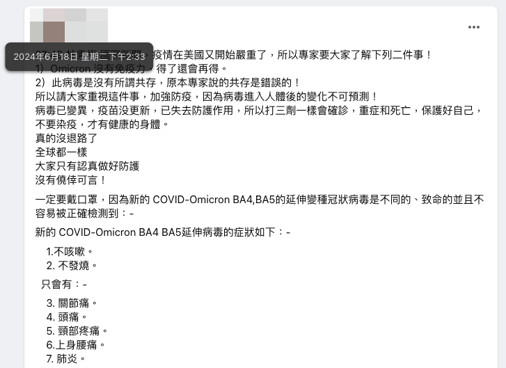 網傳「疫情在美國又開始嚴重了」貼文,文中提到 BA4,BA5 的疫情又開始嚴重,不容易檢測、直接影像肺部、疫苗失去防護作用等。但該傳言早在 2021 年就已經出現,且根據疾管署最新疫情資訊,目前流行的病毒株為 JN.1,傳染力高但感染後的疾病嚴重度上並沒有明顯差異,接種疫苗仍是預防重症及死亡的最有效方法。網傳內容為再次流傳的舊謠言,傳言為錯誤資訊。