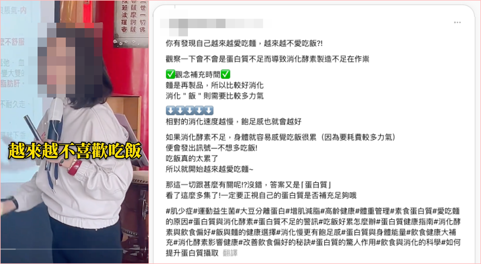 網傳「愛吃麵族注意 你的蛋白質,可能攝取不足」影片,提到麵是再製品、比較好消化,消化飯要花比較多的力氣、消化慢,身體會覺得吃飯很累,所以會越來越喜歡吃麵、越來越不喜歡吃飯。但專家表示,白麵條、白米飯都是經過加工的「精緻澱粉」,傳言以「再製」比較麵、飯是錯誤的比法;臺灣人均米飯攝取量持續降低,與麵食烹飪方便等社會因素有關,並非傳言說的是因為麵食好消化,在「全穀雜糧類」中同屬精緻澱粉的白麵、白飯,一樣都是很好消化的碳水化合物。
