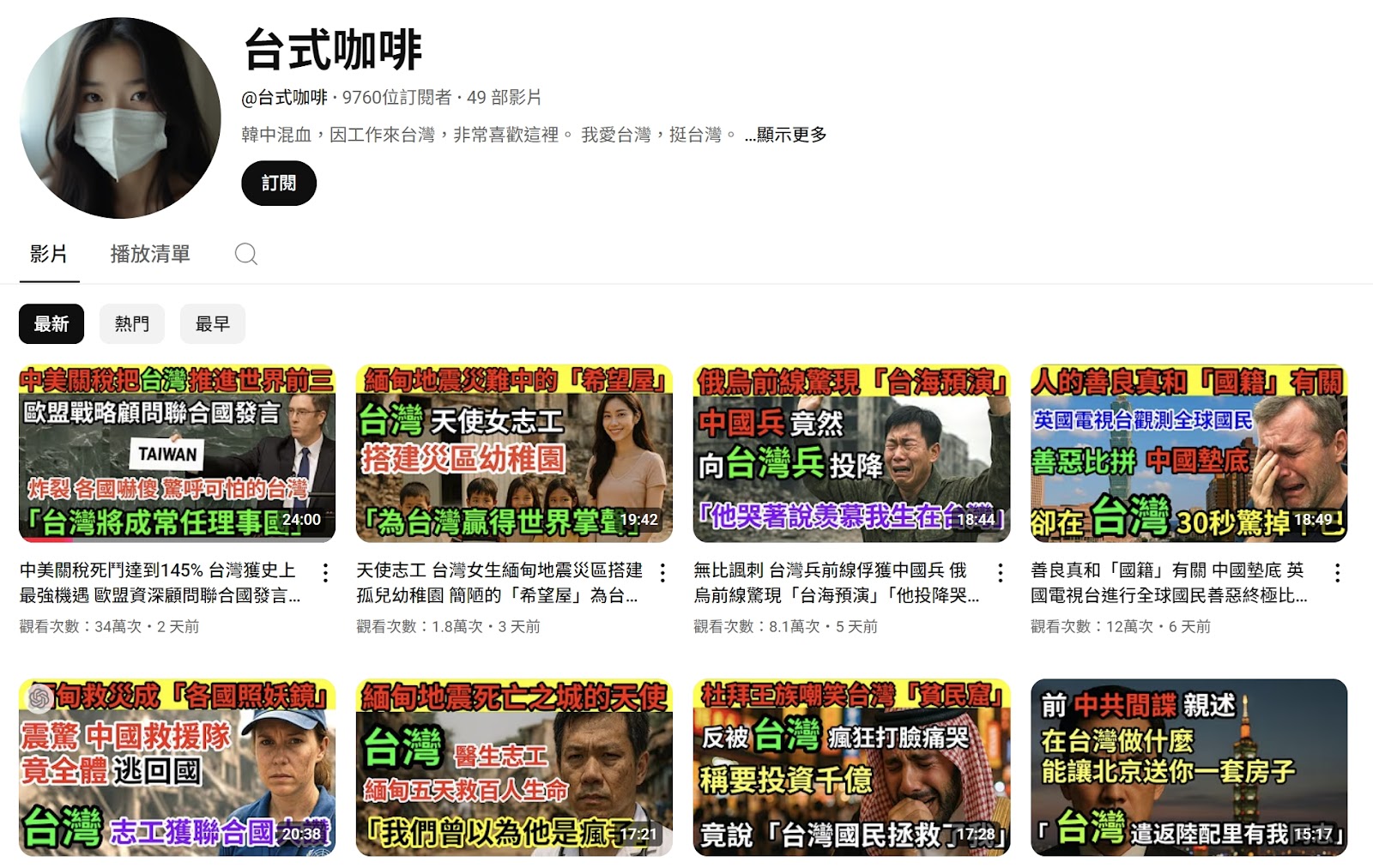 「台式咖啡」於 2025 年 1 月 17 日才開通 YouTube 帳號,簡介自稱是「韓中混血」,並稱自己希望能在「寶島」一直生活下去。該頻道一共發布 49 部影片,大部分影片長度都超過 15 分鐘,而且都有幾個特點:(1)封面首圖使用 AI 或合成照、(2)標題聳動,且會把主題用大字報方式呈現在首圖上、(3)所有主題皆與台灣有關,大多是讚揚台灣的內容、(4)影片由許多不明來源的片段構成、(5)字幕都是自動翻譯。