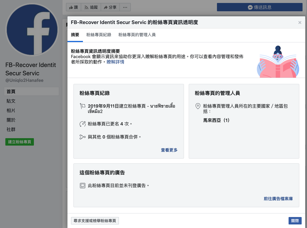 深入點進去看,會發現還改了四次名字,管理人員來自馬來西亞,甚至在 2020 年七月的時候,粉專名稱還是「Uniqlo Shop กางเกงมือ2」,這些都可以在粉絲專頁資訊透明度中看到。