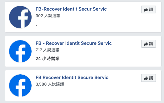 這些惡意盜用的人,會先假冒設計看似 Facebook 的官方帳號頁面,像類似「FB Secure Recover Identit Servic」的奇怪名稱的粉專,並盜用 Facebook 的形象設計在大頭貼,偽裝成臉書負責資訊安全相關的單位。