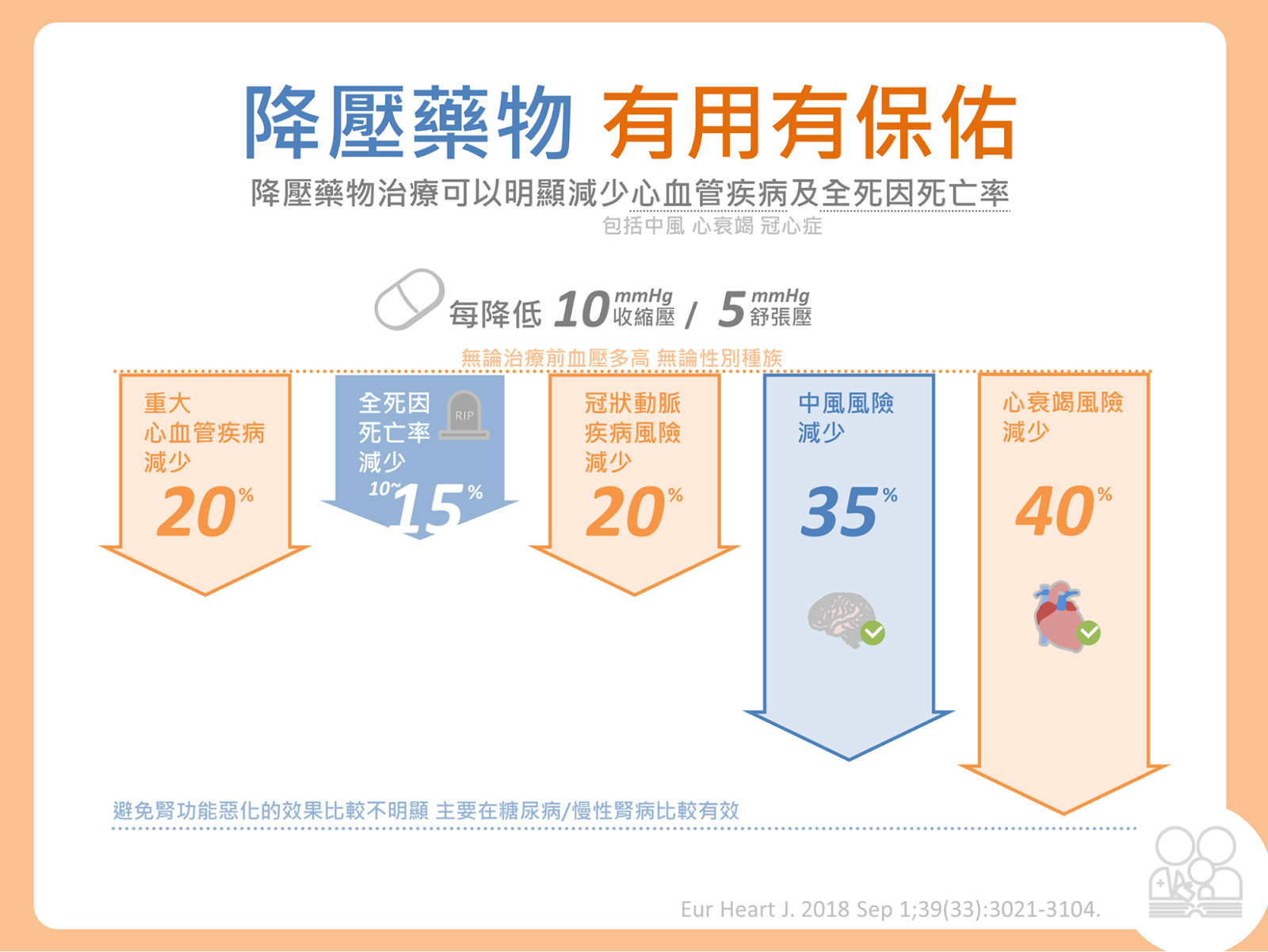 (3)PROGRESS的研究顯示,收縮壓 / 舒張壓降低 12 / 5 毫米汞柱,可降低腦中風復發機率 43%。
