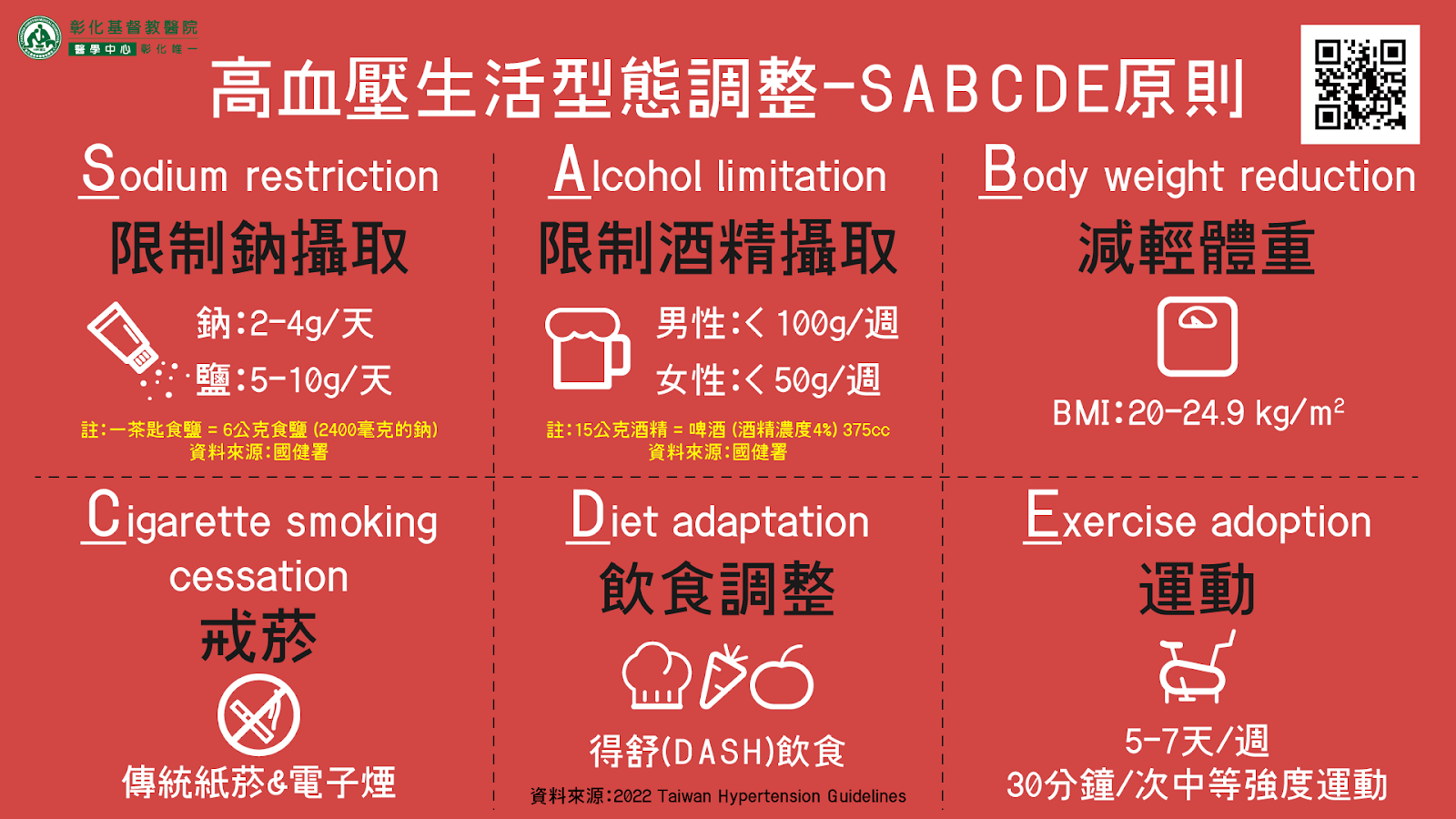 柳朋馳強調,減鹽有助降血壓是所有高血壓病患一直被不斷衛教的觀念,雖然每日建議量為 2400 毫克、大約 6 公克的食鹽,但以國健署於 2011 年公布、2019 年更新的衛教宣導中,提到歷次的飲食調查中,國人飲食「鈉」攝取量都太高,19 到 30 歲男、女性每日鈉總攝取量分別為 4599 毫克及 4096 毫克,達到建議上限的 1.9 倍及 1.7 倍,國健署也於該衛教中鼓吹,每日鹽分攝取若能降低至 6 公克以內,則血壓平均可下降 2 到 8 毫米汞柱,相當於每日服用 1顆長效型抗高血壓藥物的效果,所以飲食減鹽的觀念甚至是不分族群、不管有沒有高血壓、不論是不是正在服用降血壓藥物的,目前的高血壓衛教中都會提到「SABCDE」的介入,其中排名第一個的「S」就是鈉、就是減鹽,可見在非藥物的降血壓方式中,鹽分的攝取佔有多麼重要的地位,所以不管是「高血壓前期」(prehabitation)、或是已經達到高血壓的診斷標準、已經在吃藥的病人,應該要做的 SABCDE 都應該認真努力做,這些生活型態的調整都已經被證明是可以減少藥物的堆疊,但是如果沒有時間、空間的情況下,或是病人在這些項目都已經做得很優秀、可是血壓還是降的不夠,在病程發展的重要節點、或是黃金治療時機時,醫師還是得用藥物的方式立刻處理。