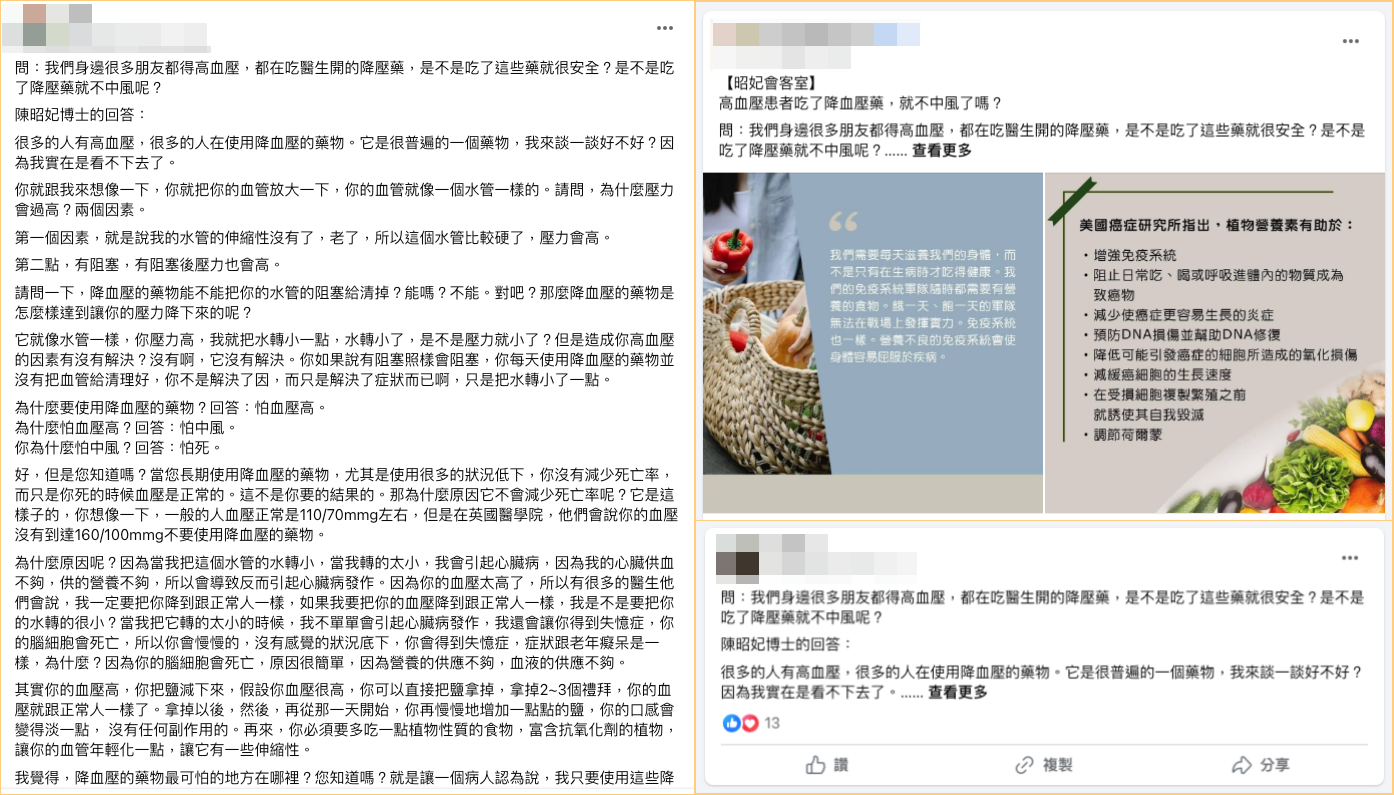 網傳一段有關陳昭妃講降壓藥、血壓、減鹽的文章,提到「長期使用降血壓藥物,尤其是使用很多的狀況下,沒有減少死亡率」、「你死的時候血壓是正常的,這不是你要的結果的」,「一般的人血壓正常是 110/70 左右,但是在英國會說血壓沒有 160/100,不要使用降血壓藥物」,「把鹽拿掉,拿掉 2~3 個禮拜,血壓就跟正常人一樣了」,「降血壓的藥物最可怕的地方,就是病人認為吃了藥、可以繼續吃紅燒肉」。但專家表示,高血壓生活型態調整「SABCDE」原則,其中 S 就是 Sodium 鈉、就是食鹽氯化鈉的意思,可見高血壓病患不管有無服藥中,都應該減鹽,減鹽能夠減藥,但是不能因此擴大、延伸,影射地說成取代藥物的易誤導說法,或甚至說成藥物不能降死亡率的錯誤說法。
