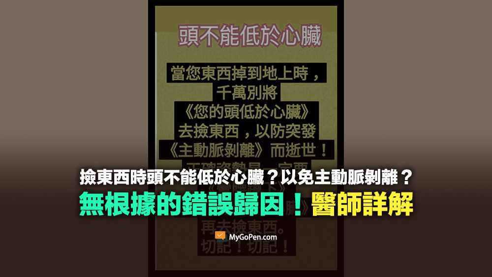 傳言提到「千萬別將頭低於心臟去撿東西,以防突發主動脈剝離而逝世」。MyGoPen 致電諮詢振興醫院心臟血管內科醫師陳冠群,他表示主動脈的形狀就像拐杖,直徑約 2.5 到 3.5 公分、是全身最大的動脈,「升主動脈」從左心室分為三條往腦部及上肢的主動脈弓,向下為「降主動脈」、到骨盆腔分成髂動脈,是體循環動脈系統的主幹,當血管內膜因高血壓或動脈壁上的粥狀硬化破裂、使血液進入血管壁內層,這樣就稱做「主動脈剝離」,陳冠群指出,主動脈剝離的危險因子包括年齡老化、高血壓、動脈硬化、外傷、發炎以及結締組織疾病,特別是在天氣驟變,忽冷忽熱的時候更需要特別注意,主動脈剝離的危險因子不包括頭部高低姿勢改變,主動脈剝離除非裂的範圍是血管供血的開口,不然兩者並沒有直接關聯性,而低頭撿東西的姿勢改變,也並不會影響到心臟本身冠狀動脈的血流、與心肌梗塞無關。傳言說法錯誤。