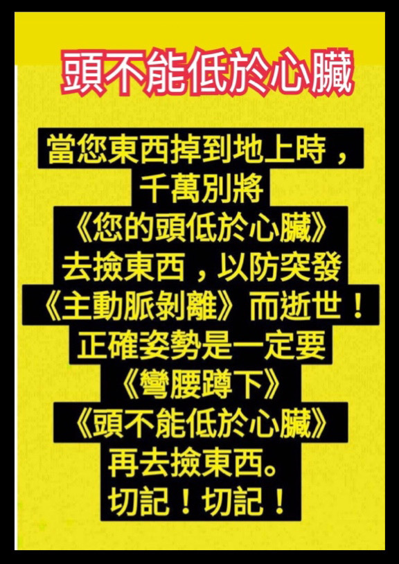 ❤️當您東西掉到地上時,千萬別將《您的頭低於心臟》去撿東西,以防突發《主動脈剝離》而離世!   🌹正確姿勢是一定要《彎腰蹲下》《頭不能低於心臟》再去撿東西。 切記!切記!