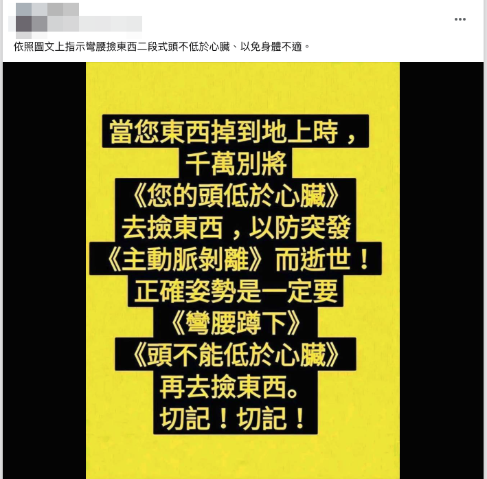 網傳「頭不能低於心臟」圖卡,提到頭低於心臟去撿東西,易發生主動脈剝離,正確姿勢是彎腰蹲下、頭不能低於心臟。但專家表示,傳言說法並非事實,主動脈剝離的最重要危險因子是高血壓,心血管不好的人,反而是從低位姿勢、復原變回高位姿勢時,易有「姿勢性低血壓」,出現頭暈、跌倒等風險,並非傳言說的高位變低位;高風險族群應避免用力搬重物,過量、過強的運動。