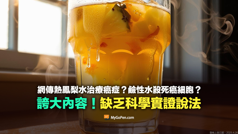 網傳「癌症被戰勝了 鳳梨熱水」的貼文聲稱,鳳梨熱水可預防癌症、殺死癌細胞,甚至「已被證明能治癒所有類型的癌症」。然而,根據國際事實查核單位的報告,以及美國知名癌症醫院官網的衛教資訊指出,目前尚無足夠證據顯示鳳梨酵素對人體癌症具有影響,亦未被證實具備治療或預防癌症的效果。此外,台灣食藥署也曾闢謠表示,鳳梨酵素主要從非食用部位的鳳梨莖中萃取濃縮而來,一般飲食中攝取的酵素量相當有限,因此無法發揮抗發炎或抗癌效果。