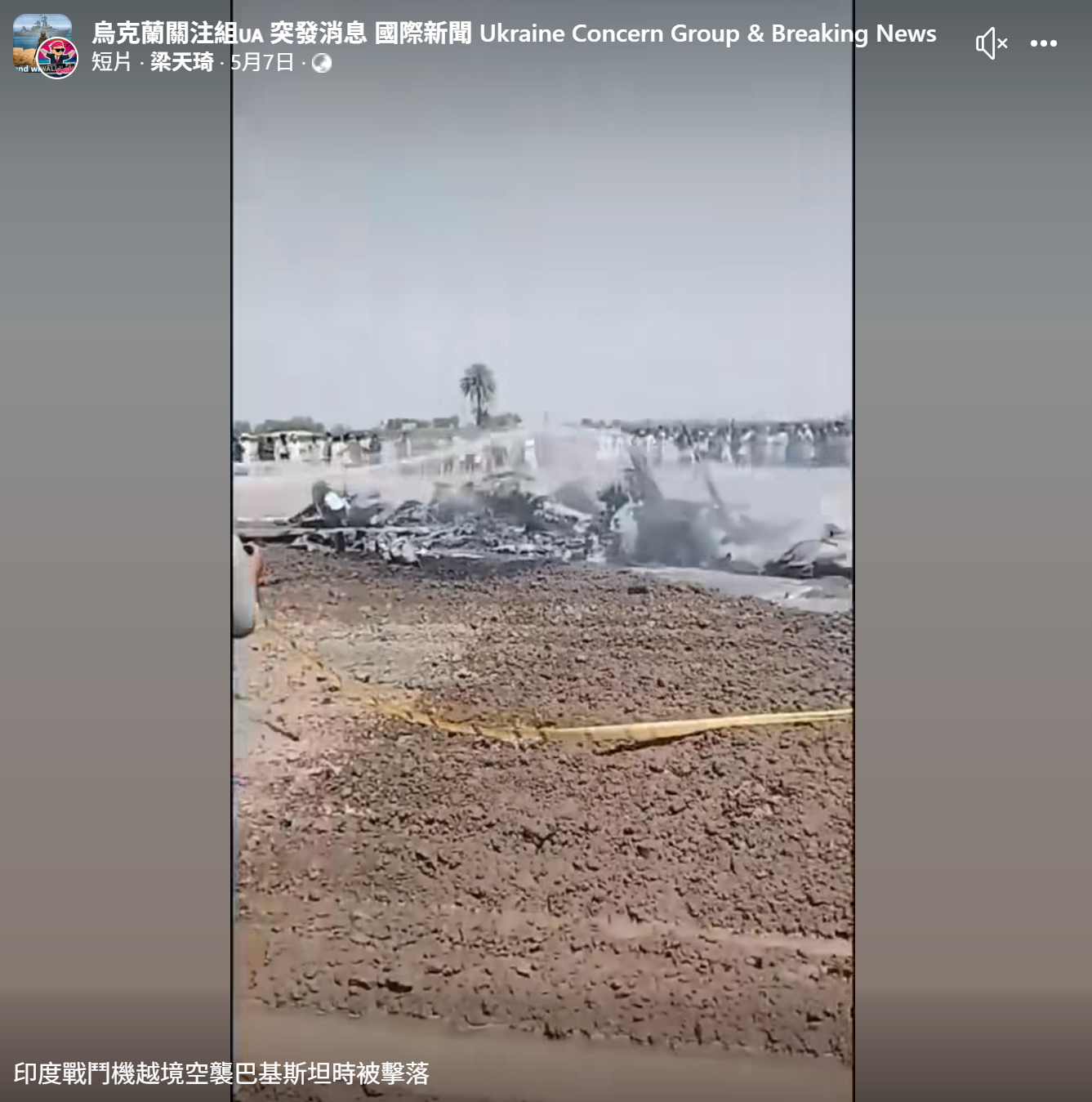 網傳「印度戰鬥機越境空襲巴基斯坦時被擊落」的訊息和飛機殘骸影片。經查證,傳言影片最早在 2025 年 4 月 15 日就已經開始在網路上流傳,早於近期印巴衝突開始之前,並非印度戰鬥機被巴基斯坦擊落的畫面;根據巴基斯坦媒體報導,當時巴國空軍的一架幻象 5 ROSE 在執行訓練任務時發生技術故障,因此失控墜毀在農田,傳言敘述為錯誤訊息。
