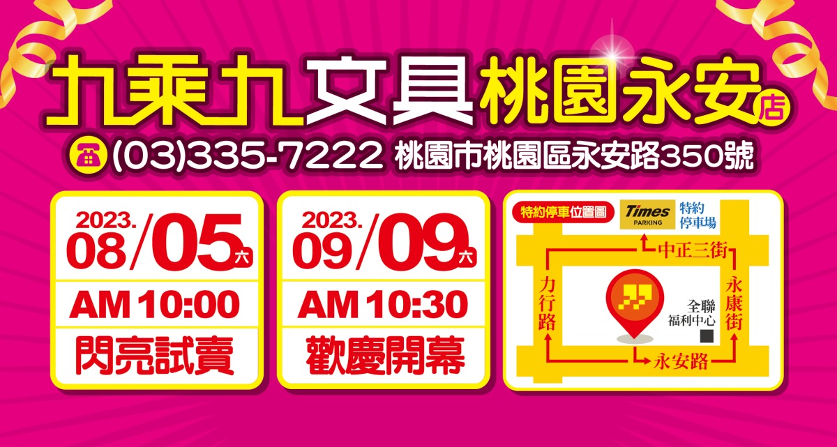 國內文具零售龍頭「九乘九文具」將在桃園市創立最大文具百貨,全台第22間實體門市(桃園永安店),於8月5日啟動試營運 ,並於9月9日正式盛大開幕,凡於9月9、10日開幕首兩天排隊就送100元商品抵用券,限量100名。