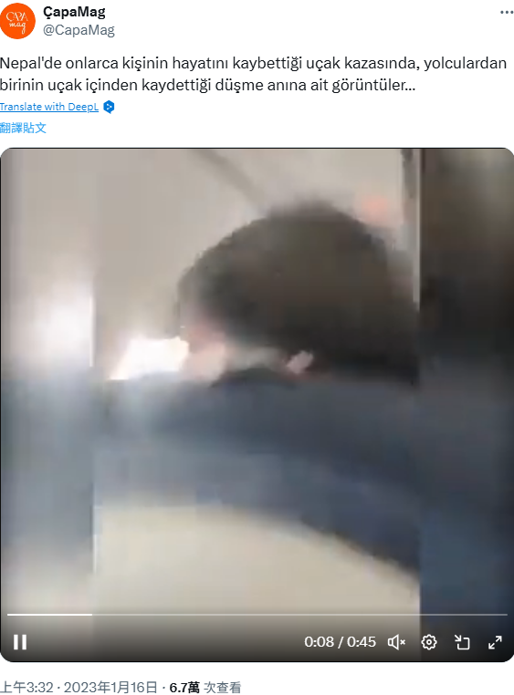 (二)以尼泊爾飛機失事為線索進一步搜尋,查找到《Fox News》當時報導此事件的新聞中有相同的影片;報導指出,2023 年 1 月 15 日,一架從尼泊爾加德滿都飛往波卡拉的雪人航空班機墜毀,機上 72 名乘客全數罹難,這段影片是機上乘客在飛機降落時拍下的最後畫面。