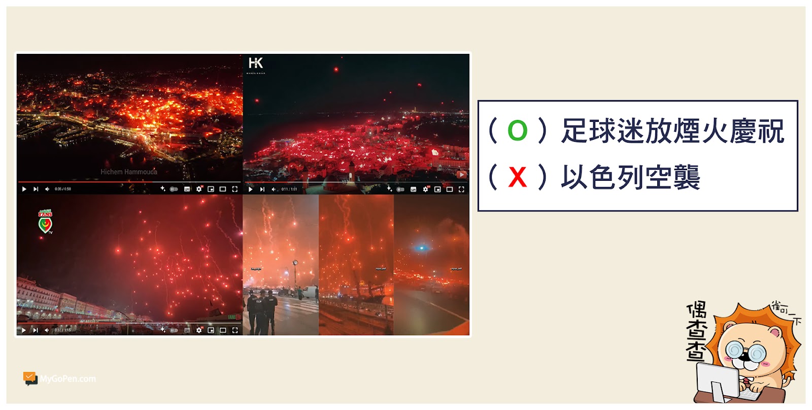 補充:AFP Fact Check、Reuters Fact Check 等國際事實查核單位,在 2023 年 10 月時也曾查證過類似的影片,都是將阿爾及利亞施放煙火的影片,誤導為以色列或加薩走廊上空的畫面,MyGoPen 當時也有做成查核報告。
