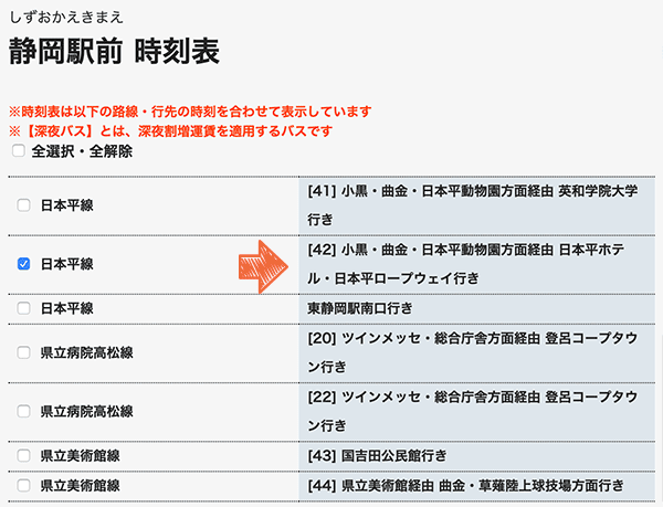點上面的時刻表,並且只剩下 [42] 小黒・曲金・日本平動物園方面経由 日本平ホテル・日本平ロープウェイ行き 這一條路線