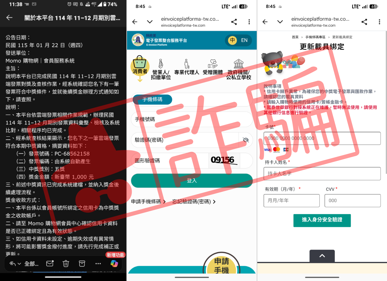 近期許多民眾會收到詐騙集團寄出的釣魚電子郵件,通常打著 MOMO、PC Home、蝦皮、酷澎等電商平台的名義,聲稱雲端發票中獎,並提供財政部電子發票整合服務平台網址連結,要民眾填完資料才能領取。實際上,這是詐騙集團架設的偽冒網站,填完手機號碼登入後,網站會顯示「歸戶異常」,並要受害者重新填寫信用卡資料,如果警覺心不夠,個資帳號將遭到竊取,詐團會藉此進行盜刷,騙取錢財。提醒民眾,收到可疑電子郵件,或是要你填寫信用卡卡號的網站,一定要保持警惕,確認網址風險。