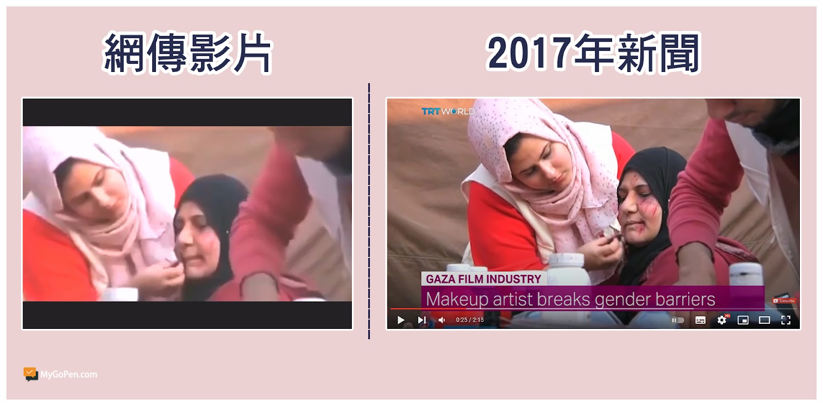 利用原始影片下方的標題「 GAZA FILM INDUSTRY 」、「 Makeup artist breaks gender barriers 」等進行搜索,可以找到《土耳其廣播電視公司國際頻道》( TRT World )2017 年 3 月 2 日於官方 YouTube 頻道上傳的影片《 Palestinian film industry | Cinema | Showcase 》,經檢視後確認即為網傳影片原始出處。