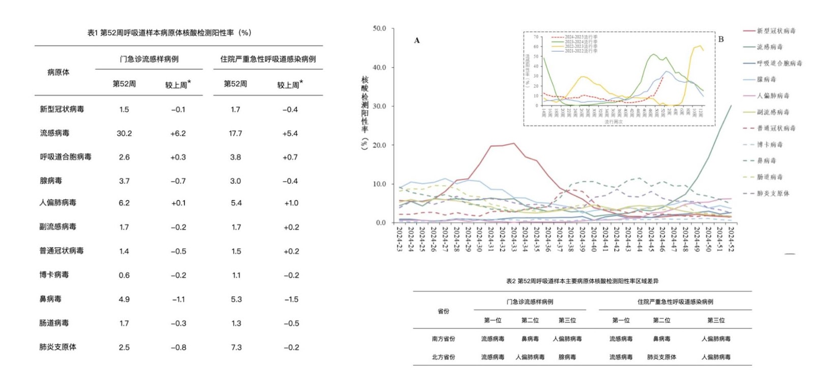 傳言提到「人類偏肺病毒導致中國各地醫院大爆滿,14歲及以下呈波動上升趨勢、北方省份更明顯」。MyGoPen 查詢中國疾病預防控制中心所發布的「全国急性呼吸道传染病哨点监测情况(2024年第52周)」(12月23日 - 12月29日)最新資料,呼吸道樣本病原核酸檢測陽性率第一名為「流感病毒 30.2%」,第二名為「人類偏肺病毒 6.2%」,第三名為「鼻病毒 4.9%」,第四名「腺病毒 3.7%」,第五名「肺炎支原体 2.5%」,其中第五名的「肺炎支原體」臺灣稱為「肺炎黴漿菌」。