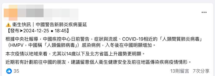 網傳「衛生快訊|中國警告新肺炎疾病蔓延」、「又爆人偏肺病毒 致死率高」的貼文,提到「最近又出現人類偏肺病毒HMPV,特定人群死亡率高達 43%」,「中國各地醫院大爆滿,14 歲及以下、北方省份更明顯」,「目前沒有疫苗及藥物」。但根據臺灣主管機關疾管署的公開資料,台灣過去二個月的監測疫情為「每周 0 到 2 例」,傳言只說中國疫情嚴峻、不提臺灣實際情況,易使民眾誤以為臺灣也一樣嚴重、或是即將同樣嚴重,傳言缺乏「人類間質肺炎病毒」的背景知識及相關衛教,傳言說法易誤導。