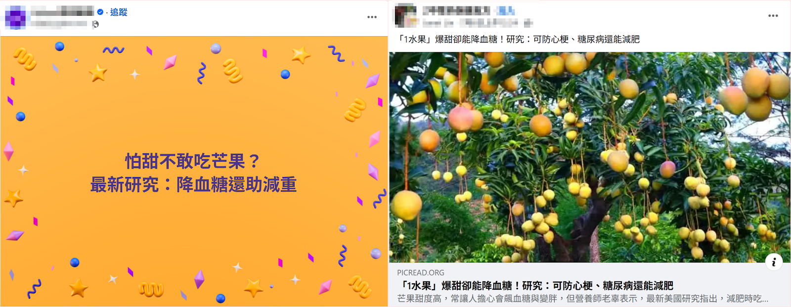 網傳「1 水果爆甜卻能降血糖」、「研究:可防心梗、糖尿病還能減肥」,提到最新美國研究指出,減肥時吃芒果,可以明顯降低糖尿病、心血管疾病的風險,還幫助減重。經查證,專家表示,該研究是針對中度肥胖者,進行為期 4 周,每天 200 卡、相當於 3.3 份水果的芒果攝取量進行研究,傳言轉傳的不同版本中往往漏掉細節,會使人誤以為是指所有人,或是誤會為吃越多效果越好,傳言為缺乏背景、去脈絡化且超譯的傳言,網傳部分內容錯誤且易誤導。