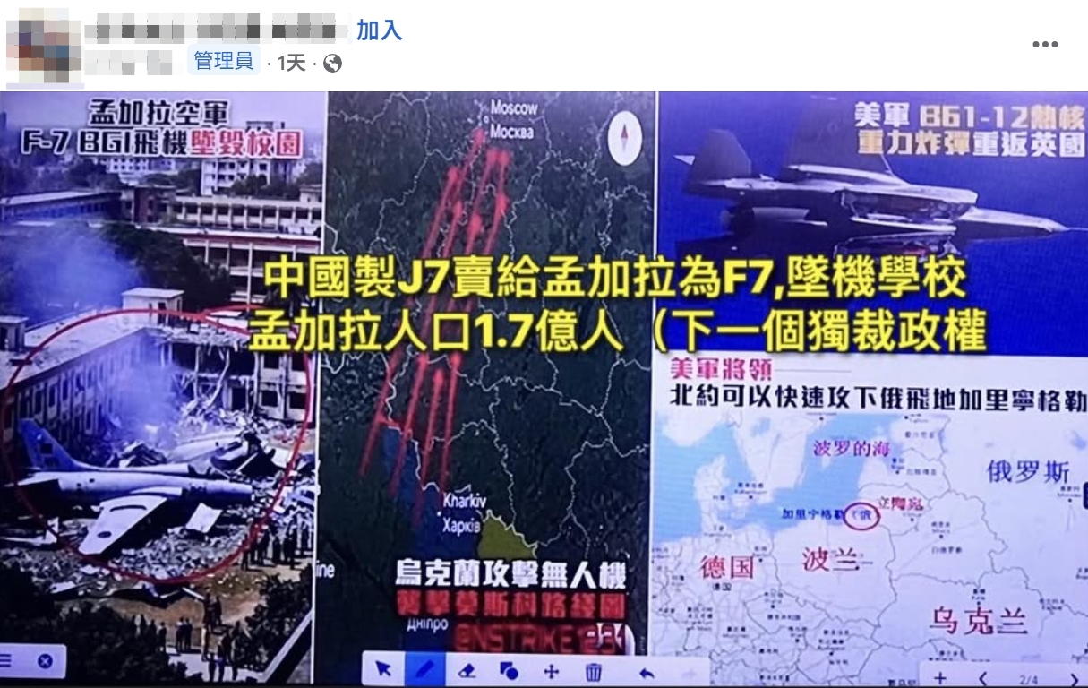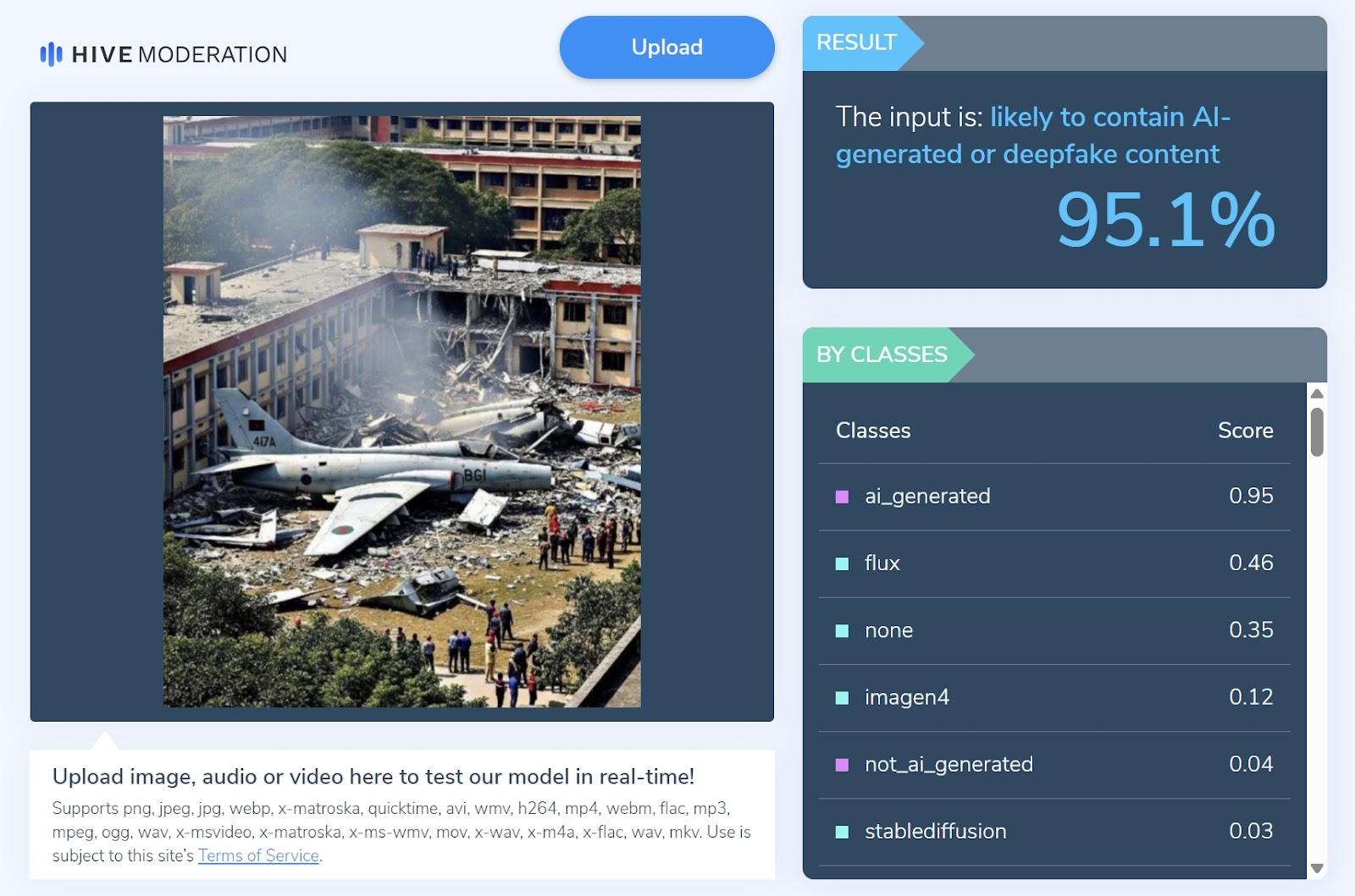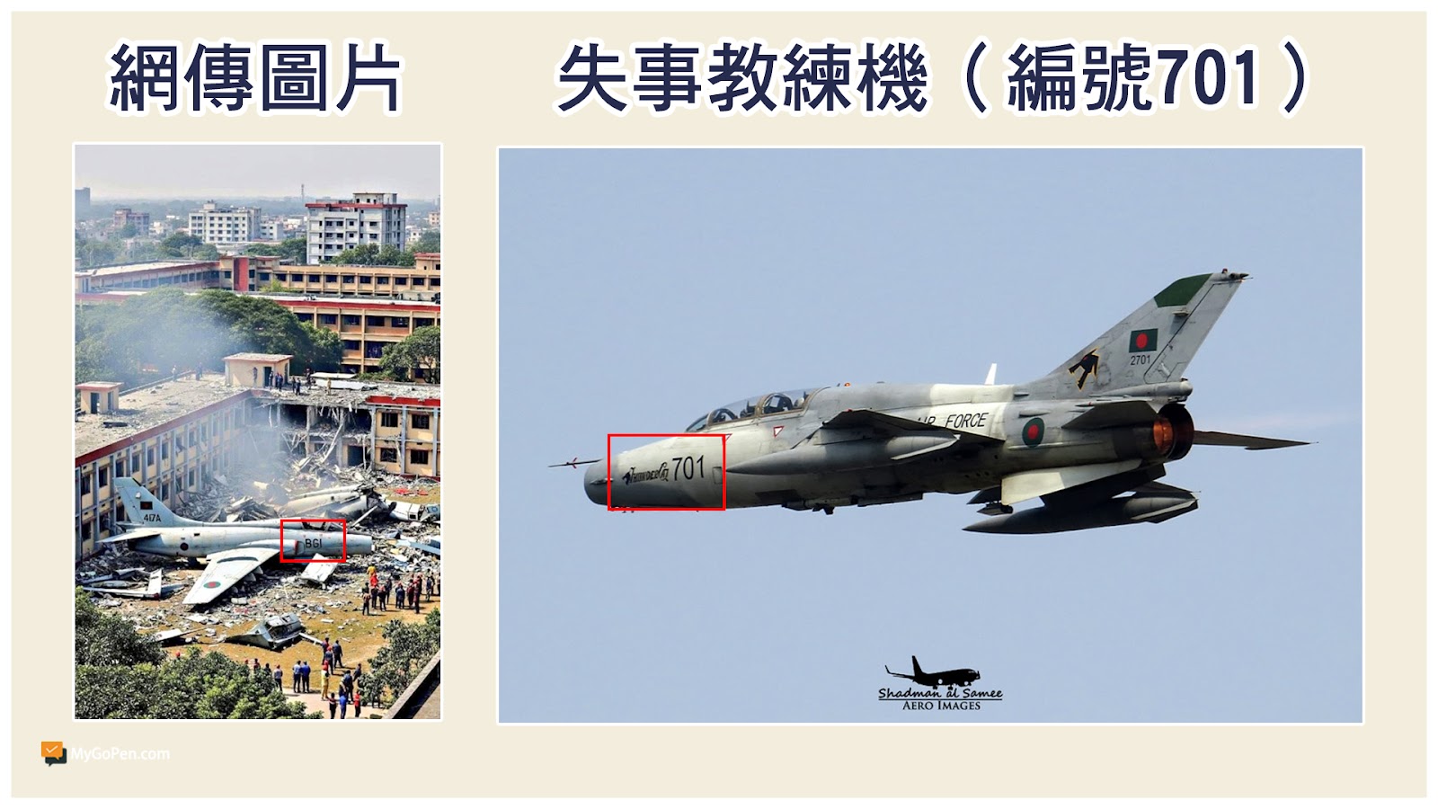 網傳「孟加拉空軍墜機照」的圖片及訊息,2025 年 7 月 21 日孟加拉首都達卡發生一起 FT-7 BGI 教練機墜毀校園事故,造成至少 31 人死亡,網路上流傳一張軍機墜毀於校園的照片。經查證,網傳照片中像是教練機與建築物的比例尺、人物與周遭環境互動等,皆有多處不合理之處,這是 AI 生成圖片常見的特點;而以 AI 圖片偵測工具進行檢測,顯示網傳圖片由 AI 生成的機率超過 90%,再比對美聯社、BBC 等媒體發布的現場事故照後,能清楚看出遭撞擊的建築物並非網傳圖片中的建物,現場也找不到完整的機身;而且機身上的編號,也與發生事故的教練機不同,可以確定網傳圖片為 AI 生成圖片,並非真實照片。