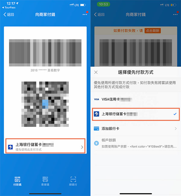就會顯示付款的條碼,最下面是你要付款的方式,這裡的預設就會是上海銀行儲蓄卡 (XXXX)