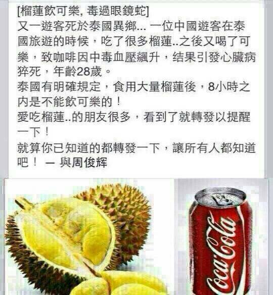 【錯誤】吃榴槤又喝酒會死?不能和可樂一起吃?勿過度解讀!缺乏科學實證