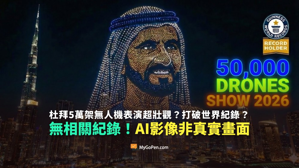 網傳「杜拜 5 萬架無人機秀」的影片及訊息,內容聲稱杜拜哈里發塔前廣場日前舉行無人機表演,6 分鐘內出動 5 萬架無人機,成功打破金氏世界紀錄(Guinness World Records)。經查證,網傳影片是 AI 生成影像,並非真實場景,截至本次查核報告上架前,「單台電腦控制最多多軸飛行器/無人機同時飛行」的紀錄為 15,947 架,並非 5 萬架,網傳訊息不正確。
