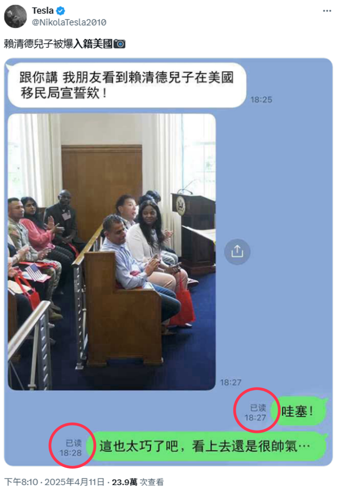 (一)將網傳圖片反搜,初步先查找到網路上最早是在 2025 年 4 月 11 日開始流傳此張圖片,是一個 X 帳號「NikolaTesla2010」所發布,並宣稱:「賴清德兒子被爆入籍美國」;但仔細檢視畫面,可以發現通訊軟體對話中的「已讀」字樣是簡體字。