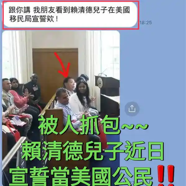 網傳「賴清德兒子被爆料在美國移民局宣示當美國公民」的訊息和照片。經查證,傳言圖片是截取美國賓州伊利郡外籍人士的歸化儀式,把一名不丹男子的臉後製變造成別人的臉,並不是賴清德兒子,傳言為錯誤訊息。