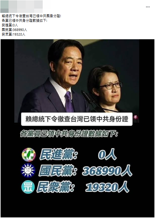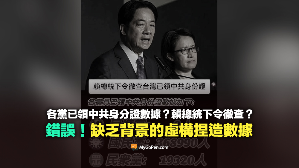 【錯誤】網傳各黨已領中共身分證數據?賴總統下令徹查?缺乏背景的虛構數據