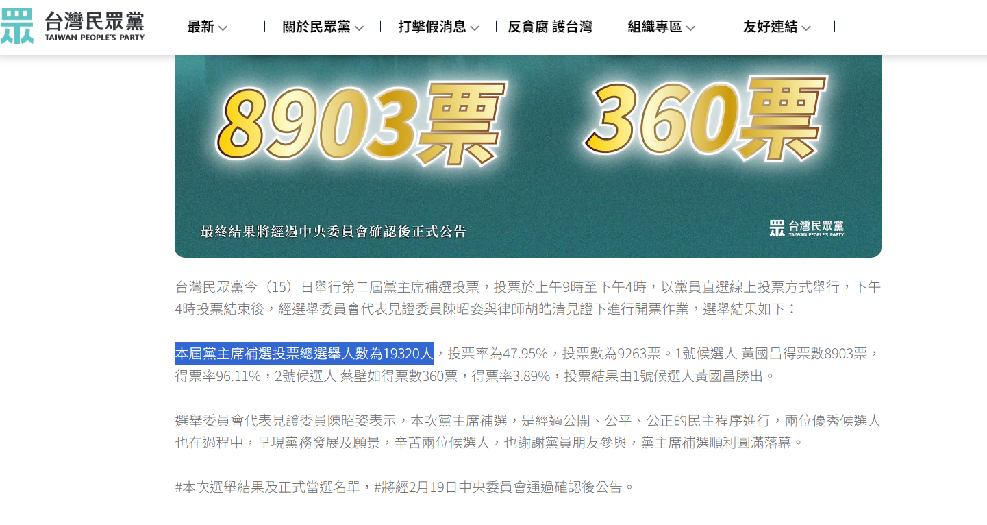 而圖卡中民眾黨的 1 萬 9,320 人,經查證,此數據是來自該黨第二屆黨主席補選投票的總選舉人數,民眾黨在舉行補選投票時時有發佈官方新聞,可於 2025 年 2 月 15 日的新聞稿裡看到這一數字。