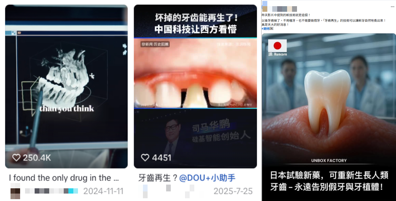網傳「日本真的要讓人長回牙齒了」、「全球首款牙齒再生藥物正式進入人體試驗階段」貼文,提到日本正在第一期人體臨床實驗的抗 USAG-1 抗體藥物,可望讓人類牙齒再生,掉牙後不用假牙、不用植牙,讓新牙自然長回來。但專家表示,目前這項技術是誘發「牙胚」發育、不能擴大成後天的掉牙也能長回來,植牙技術發展了 40 年才趨於成熟,傳言卻說「2030 年可望正式商品化」,傳言將目前的科學證據、研究進度,與未來的願景交錯敘述、混為一談,傳言錯誤。