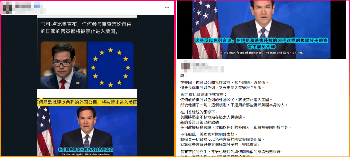 網傳「美國務卿魯比奧:任何參與審查制裁自由國家的官員,都將禁止進入美國」的訊息。經查證,盧比歐並沒有說要禁止任何發布反對或批評以色列言論的外國人入境,美國政府也沒有宣布這樣的政策。不過,2025 年 5 月 28 日,盧比歐的確公布了一項新的簽證政策,針對參與審查美國人言論的外國官員和個人進行限制;同一天,他在打擊反猶太主義國際會議上表示,美國已經實行一項新簽證政策,可防止外國人進入美國煽動對猶太社群的仇恨。但這是針對反猶太主義的作為,對猶太人的仇恨言論和反以色列言論是不同的,不應混為一談。