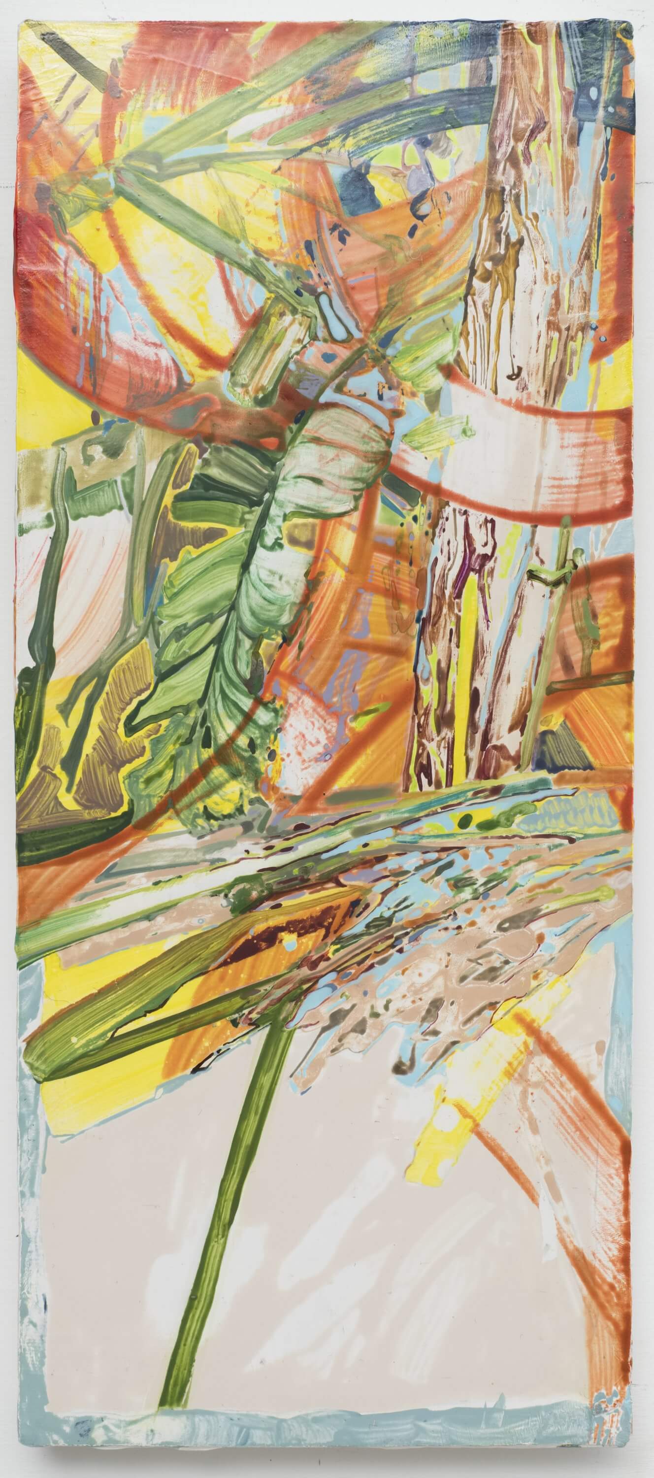 作品《不會在了的路口》源於一個不會再感受的視覺經驗、不會再去的地方。傅寧在手機中注意到這張照片時能夠辨別場景是何處,也能夠記得當時經常在那邊等待,卻不大記得自己拍攝當下的狀態了。面對著這個不是刻意拍下的畫面,傅寧首先以不同的筆觸鋪陳了或厚或薄的淺黃色顏料,接著進行視覺元素的轉換。透過視覺動線的梳理,直觀地描繪了對於記憶的感知。於是作畫成為了一個回望記憶的過程,也像是發布一則限時動態的行為。