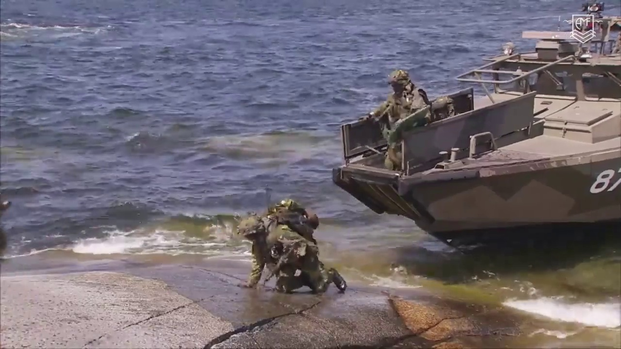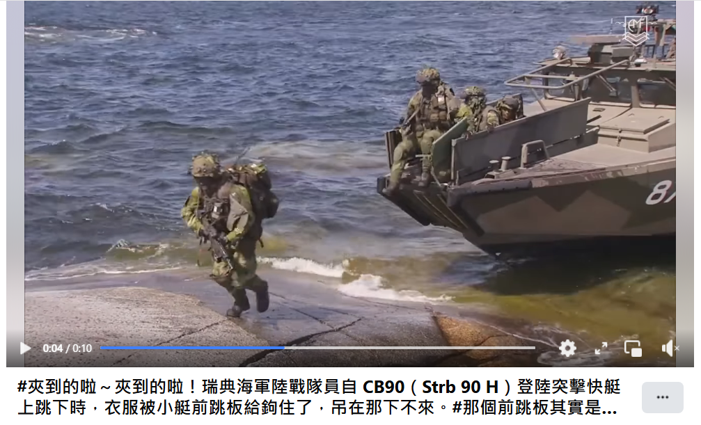 檢視該專頁發布之版本可知,網傳影片經過水平翻轉,並將右上角原有的浮水印給裁切掉;且根據貼文,這是瑞典海軍陸戰隊員自 CB90(Strb 90 H)登陸突擊快艇上跳下時,衣服被小艇前跳板給鉤住的畫面。