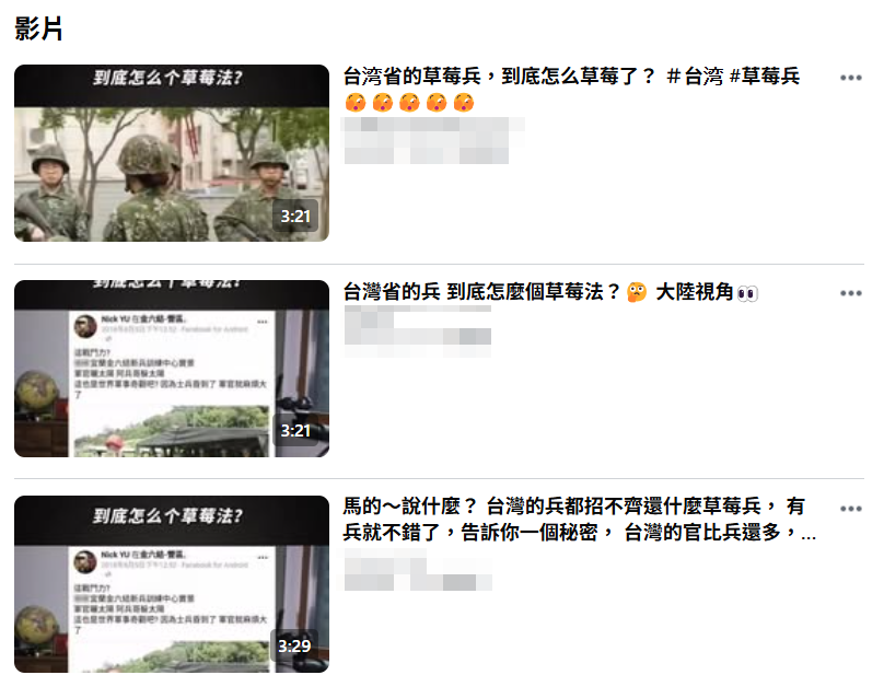 網傳「台灣省的草莓兵,到底怎麼草莓了?」的訊息和影片。經查證,傳言影片中的登陸和實彈射擊片段都不是台灣國軍的相關畫面,影片中對國軍體能標準的敘述也不正確,首先義務役和志願役的體能鑑測項目、合格標準都不同;志願役的鑑測項目較多,合格標準也較嚴格,並依年齡段再細分成 3 類。傳言敘述錯誤,且含有大量貶抑台灣國軍之內容,提醒民眾面對此類資訊操弄應提高警覺。