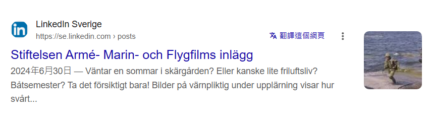 (二)以浮水印為線索進一步搜尋,查找到其為「瑞典陸軍、海軍陸戰隊和航空電影基金會」(Stiftelsen Armé- Marin- och Flygfilm,AMF)的 logo;且該基金會確實曾在 Linkedin 網站上發布相同影像,雖然現在已無法查看該則貼文,但 Google 還留有預覽頁面。