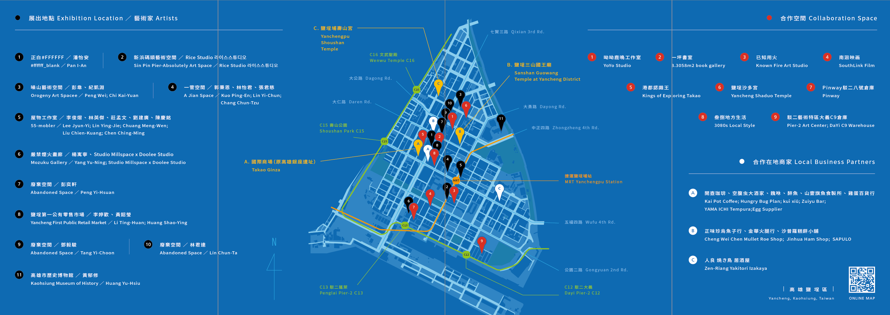 本屆展覽涵蓋6個鹽埕在地藝術空間(嚴禁煙火畫廊、噪山藝術空間、一菅空間、正白#FFFFFF、新浜碼頭藝術空間、屋物工作室),3個閒置重啟空間,以及鹽埕第一公有零售市場、高雄市立歷史博物館等2處戶外公共場域,共計11個展出地點。