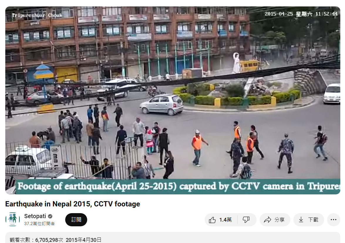 (二)由於 TinEye 的相關連結均已失效,再進一步以 Google 搜尋,查找到尼泊爾媒體《Setopati》的官方 YouTube 頻道在 2015 年 4 月 30 日發布的一則影片中含有相同片段,根據影片資訊欄指出,這是尼泊爾加德滿都在 2015 年 4 月 25 日發生地震時的監視器畫面,影像來源為尼泊爾警方。