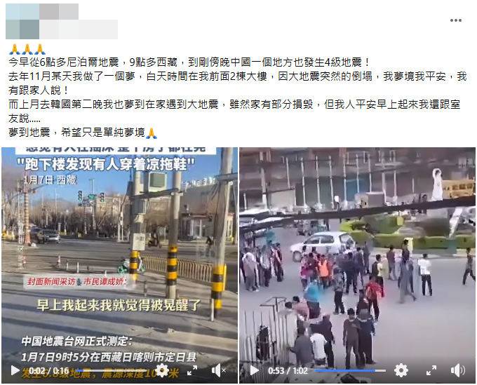🙏🙏🙏 今早從6點多尼泊爾地震,9點多西藏,到剛傍晚中國一個地方也發生4級地震! 去年11月某天我做了一個夢,白天時間在我前面2棟大樓,因大地震突然的倒塌,我夢境我平安,我有跟家人說! 而上月去韓國第二晚我也夢到在家遇到大地震,雖然家有部分損毀,但我人平安早上起來我還跟室友說….. 夢到地震,希望只是單純夢境🙏