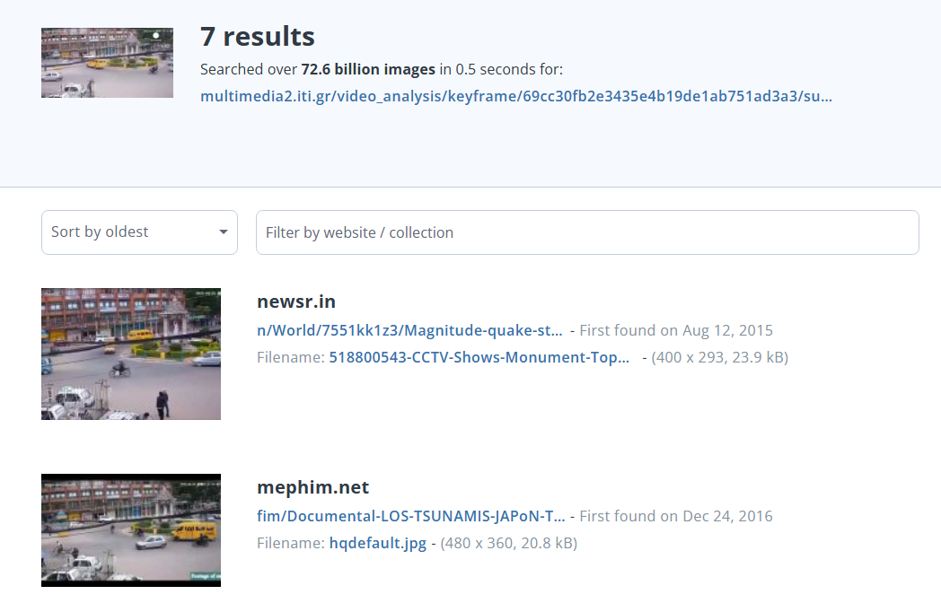 (一)透過影片反搜工具 InVID 分析網傳影片的關鍵畫面後進行搜尋,TinEye 的搜尋結果顯示,相似的影片最早至少在 2015 年就已經出現,明顯和最近西藏發生規模 6.8 地震無關