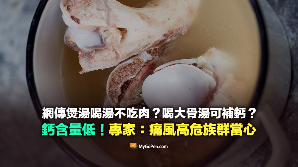 蘇秀悅補充表示,過去常有老人家燉大骨湯要讓小孩子補鈣長高的說法,但是鈣質是在骨頭裡面、並不會因為烹煮而溶解出來,喝大骨湯是沒有辦法補鈣的。MyGoPen 查詢網路上具代表性的公開資料,國健署曾於 2018 年公開宣導「喝大骨湯補鈣?其實喝進去的的鈣質非常少!」,提到每碗 240 毫升的湯,只含有 3.84 毫克的鈣質,大約是同樣重量牛奶的 1.6%,大骨湯的鈣質含量很低。