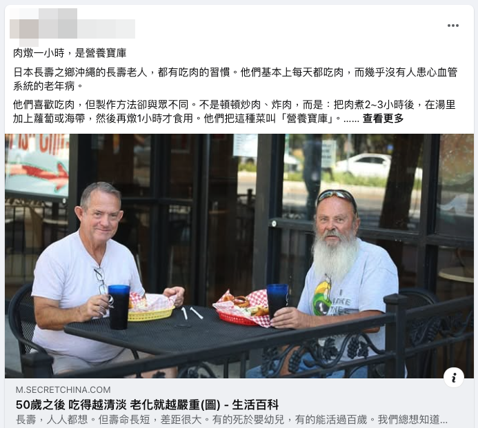傳言提到「細火慢燉好幾個小時,等到所有精華都釋放到湯中後,只喝湯不吃肉」、但也有不同版本的傳言說「肉湯的肉膽固醇含量會大大下降,這種肉含豐富的營養,是延年益壽的營養佳品」。傳言有的說應該喝肉湯中的湯、有的說應該吃肉湯的肉,不同傳言各有說法。而台北市社區營養推廣中心在 2020 到 2022 年針對台北市 65 歲以上市民所做的調查發現,有 48% 的人認為喝肉湯不吃肉也可以吃到蛋白質。