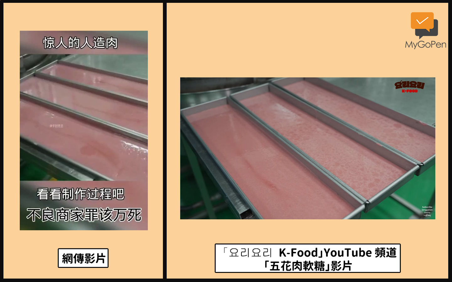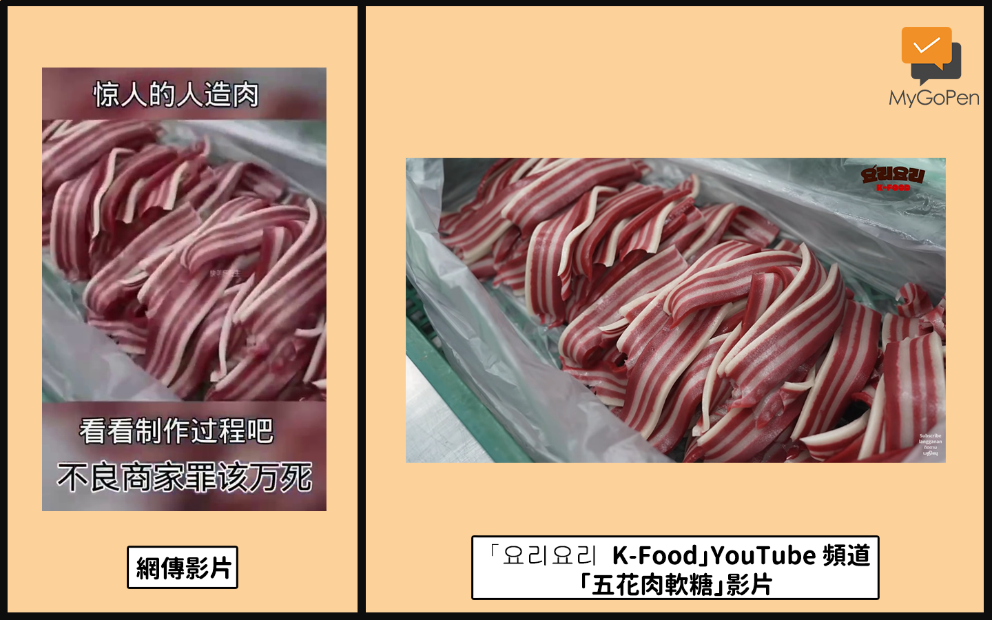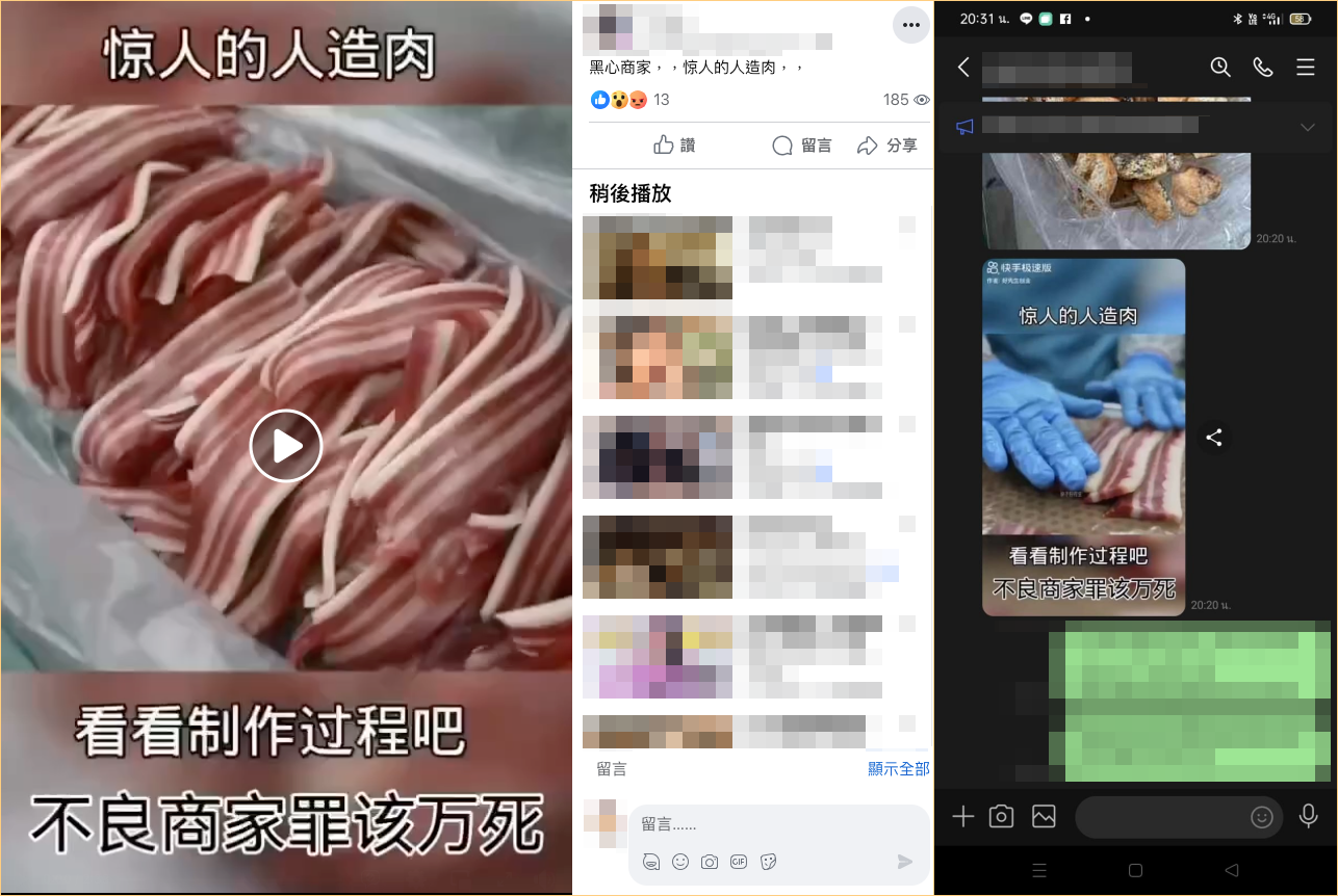 網傳「黑心商家,驚人的人造肉」的訊息和影片,內容宣稱此為黑心商家在製作人造肉。經查證,傳言影片其實是韓國工廠製作五花肉造型軟糖的過程,根據韓國媒體報導,這種軟糖在 2019 年就已經出現,為專利技術,2023 年首度透過媒體對外公開製作過程;傳言所述有誤,影片內容並非人造肉,為錯誤訊息。