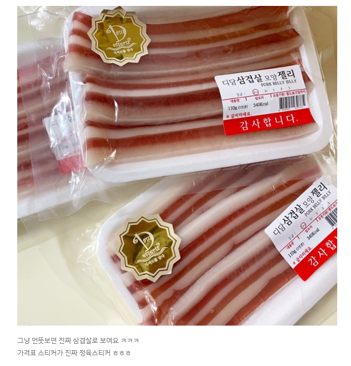 再以此為線索,搭配圖片在 Google 上搜尋,查找到一篇韓國部落格文章,內容便是在介紹這種五花肉造型的軟糖,附圖和網傳影片中看到的人造肉包裝相同。