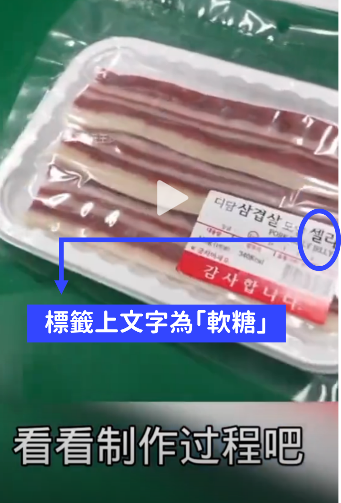 在最後 30 秒處,可看到看起來像是培根的食品被分裝、貼上標籤;經檢視,標籤上的韓文寫著「五花肉」(삼겹살)、「軟糖」(젤리)等字樣。