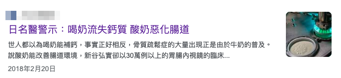 網傳「酸奶使腸道環境嚴重惡化」的文章,內容提到吃優酪乳、優格會使「腸道如同一個垃圾場」,「乳酸菌很難突破胃酸的防線」、「奶製品很可能是導致白血病等疑難病的原因」、「牛奶是給小牛用的,不是給小孩喝的」。但專家表示,益生菌對人體腸道、甚至於整體健康的幫助已有非常廣泛的研究證實,傳言說法背離整個科學界,卻只有個人說法、又提不出研究證據,提醒民眾面對這樣的傳言時,最好的方法就是提高警覺想到衛福部食藥署、國健署等單位,或是各大醫院平常衛教宣導的內容,都是建議每天早晚總共二杯奶,如果優酪乳、優格、乳製品有像傳言所說的這麼嚴重的問題,應該早就引起輿論關注,不會只有傳言引述的單一說法而已。