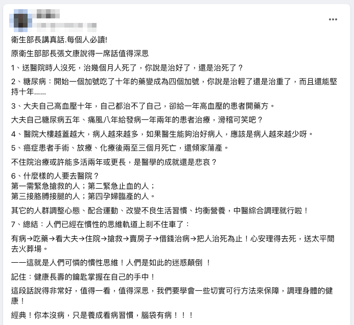 網傳「原衛生部部長張文康說得一席話」貼文,提到糖尿病、高血壓、癌症越醫越嚴重,生病看醫師是慣性思維的悲哀等說法。事實上這是流傳已久的冠名謠言,另外專家表示,全篇充斥反醫學、反科學、反權威的自然療法論調,卻沒有提出有說服力的科學實證,提醒民眾不要誤信反科學的謬論,配合正規醫療才是健康之道,例如均衡營養、配合運動、改變不良生活習慣等。