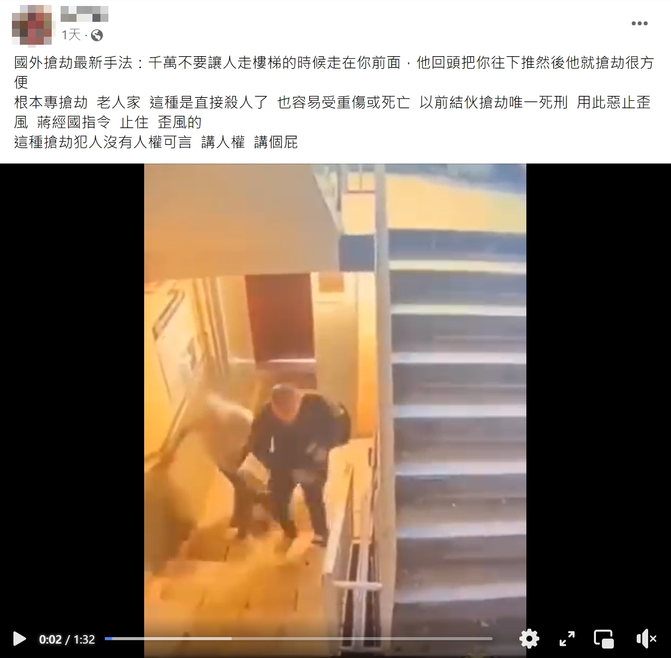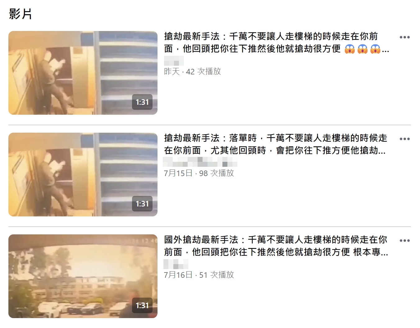 網傳「搶劫最新手法」的影片及訊息,畫面是一名男子尾隨年紀大的長者進公寓,上樓時將人推下樓梯,之後攻擊頭部再搶劫財物。經查證,網傳影片是 2024 年 6 月 12 日發生在俄羅斯聖彼得堡的案件,嫌犯是一名 42 歲無業男子,利用這種手法攻擊手無寸鐵的 8 旬婦人,再搶走財物。網傳影片及文字訊息並未提供足夠的背景資訊,容易認民眾誤以為是在台灣發生的案件。