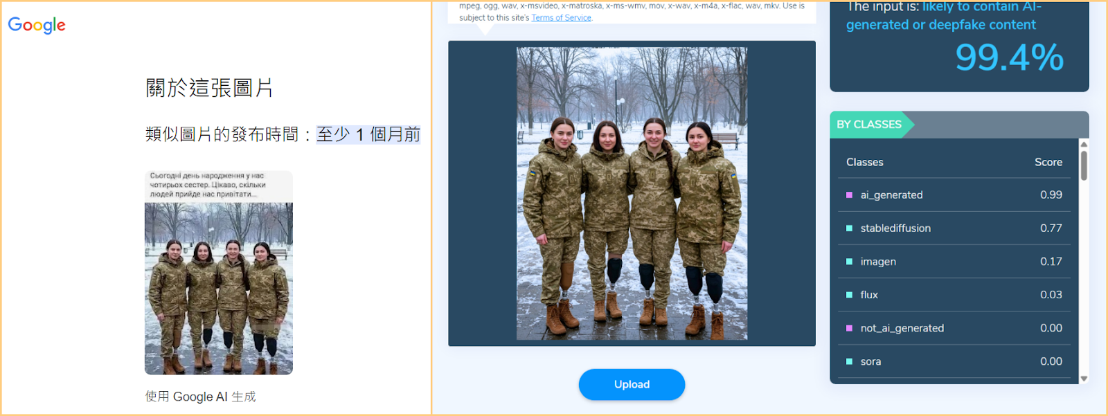 (三)網傳圖片的貼文底下有許多留言指出,照片可能是以 AI 生成;而在 Google 反搜的過程中,在「關於這張圖片」的結果中就顯示其為使用 AI 生成;除此之外,透過 AI 偵測工具 Hive Moderation 檢測,其為 AI 生成的結果高達 99.4%。