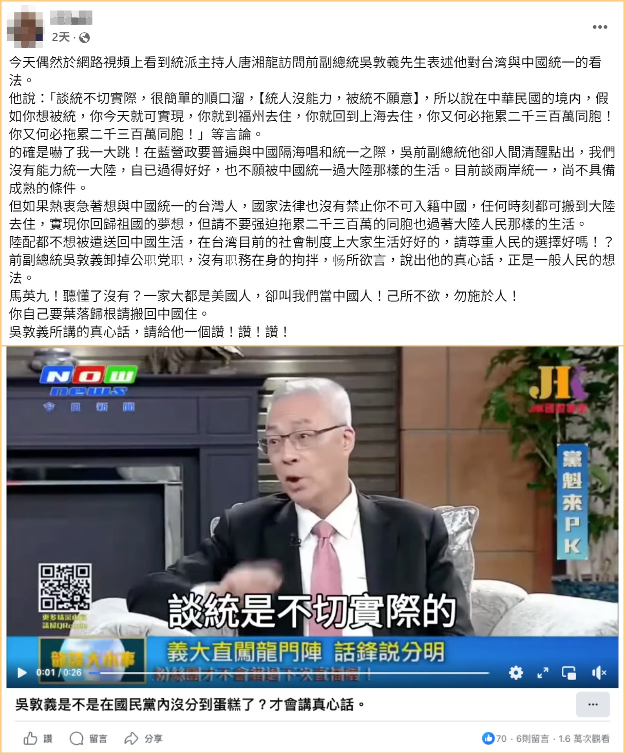 御掉公職黨職,沒有職務在身的前副總統『吳敦義』說出他的真心話! 今天偶然於網路視頻上看到統派主持人唐湘龍訪問前副總統吳敦義先生,表述他對台湾與中國統一的看法。 吳敦義說:「談統不切實際,很簡單的順口溜,【統人沒能力,被統不願意】,所以說在中華民國的境内,假如你想被統,你今天就可實現,你就到福州去住,你就回到上海去住「你又何必拖累二千三百萬同胞!」等言論。 確是嚇了我一大跳! 在藍營政要普遍與中國隔海唱和統一之際,吳前副總統他卻人間清醒點出,我們沒有能力統一大陸,自己過得好好的 也不願被中國統一,過大陸那樣的生活。目前談兩岸統一,尚不具備成熟的條件。但如果熱衷急著想與中國統一的台灣人,國家法律也沒有禁止你不可入籍中國,任何時刻你都可搬到大陸去住 “實現你回歸祖國的夢想” 但請不要强迫拖累二千三百萬的同胞也過著大陸人民那樣的生活。陸配都不想被遣送回中國生活,在台湾目前的社會制度上大家生活好好的,請尊重人民的選擇好嗎!? 前副總統吳敦義御掉公职党职,沒有职務在身的拘拌,畅所欲言,說出他的真心話,說的正是一般人民的想法! 馬英九!你聽懂沒有?你一家大都是美國人,卻叫我們要當中國人!已所不欲,勿施於人!你自己要葉落歸根請你搬回中國住。 吳敦義所講的真心話,請大家給他來個 讚!